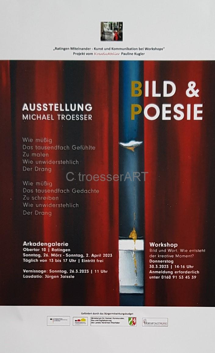 Ausstellung in Ratingen Arkadengalerie 26. März bis 2.April 2023 „Ungewöhnlich“, so begann Jürgenn Jaissle, Kunstmanager aus Solingen, seine Laudatio zu der Ausstellung in der Arkadengalerie und fragte: „Wie kann man nur Arbeiten zweier so verschiedener Gattungen zusammenfügen, der Bildenden Kunst und der Literatur, die beide unabhängig voneinander an der Weiterlesen…