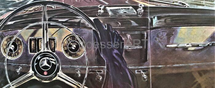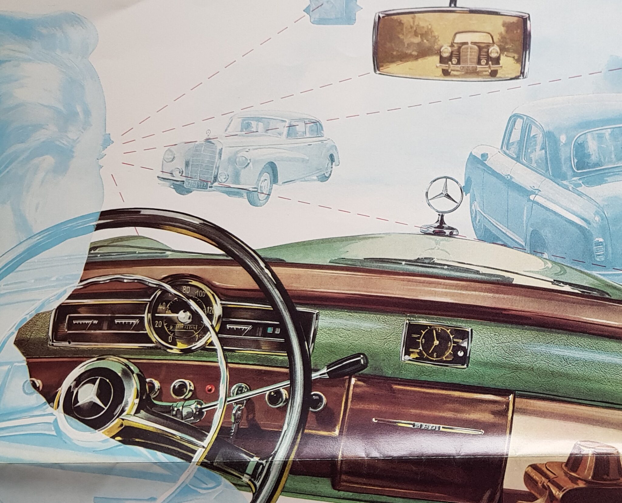 Und dieser Mittelpunkt änderte alle paar Jahre sein Gesicht, vor allem, als der erste „Ponton“ Mercedes bestellt wurde, der mit dem „dicken Hintern“ wie der Vater es ausdrückte. Ich konnte mir zwar Einiges unter „dicken Hintern“ vorstellen, dafür weniger unter „Ponton“ und ließ mich überraschen. Der Prospekt jedenfalls versprach viel Neues: “Die strömungsgünstig geformte Ganz- stahlkarosserie“, die „erhöhte Fahrsicherheit durch freien Ausblick nach allen Seiten“ und schließlich die „elegante Zeituhr, für alle Wageninsassen gut sichtbar“.